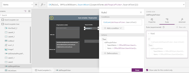 ReplyDeleteIf(Rule2, Office365Users.SearchUser({searchTerm:ddlPeoplePicker.SearchText})) check this image to configure rules.
